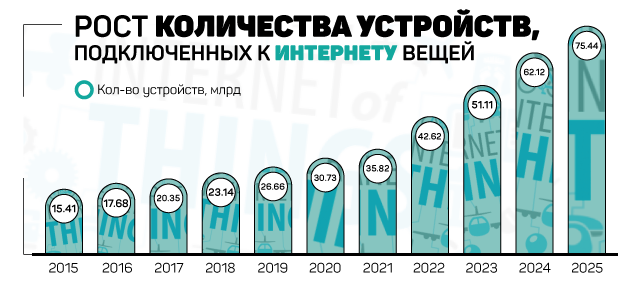 По данным аналитической компании IHS Markit, в 2015 году количество подключенных к Сети устройств насчитывало 15,4 млрд, а к 2025 году прогнозируется пятикратное увеличение — до 75,4 млрд устройств.